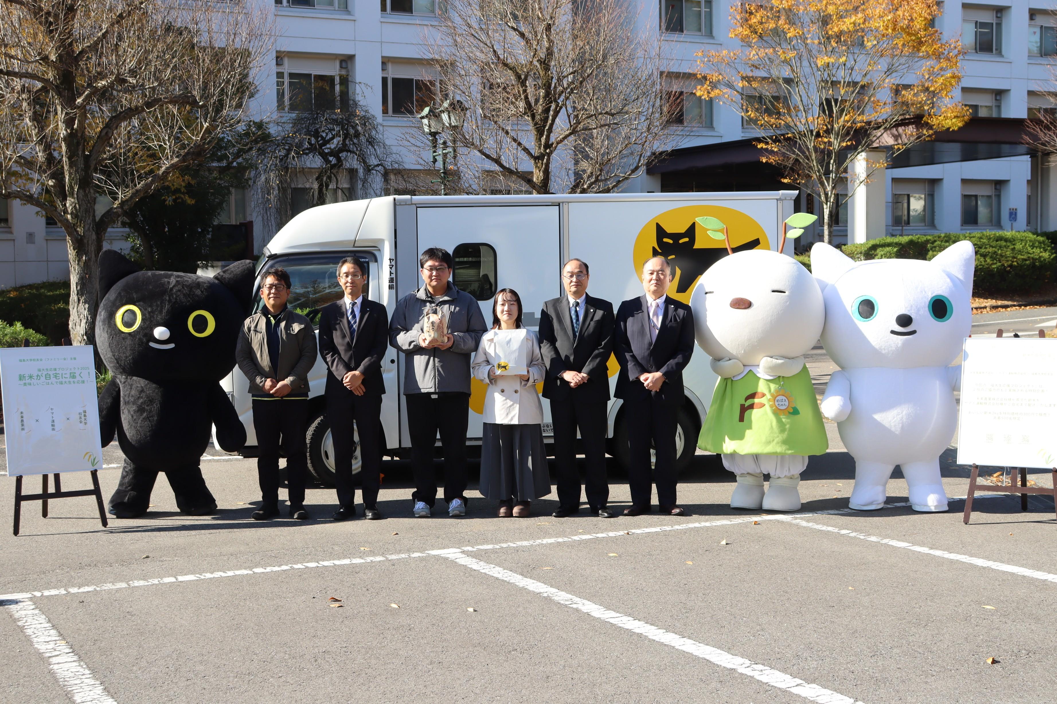 また、本企画の開催を記念して令和7年11月12日には記者会見が行われました。未来農業株式会社(代表取締役:丹野友幸氏)、ヤマト運輸株式会社(福島主管支店長:石毛智昭氏)、購入した学生らが参加し、今回のイベントへの思いを語りました。同大公式マスコットキャラクターのめばえちゃんに加え、ヤマトグループ公式キャラクターのクロネコ・シロネコも参加しました。