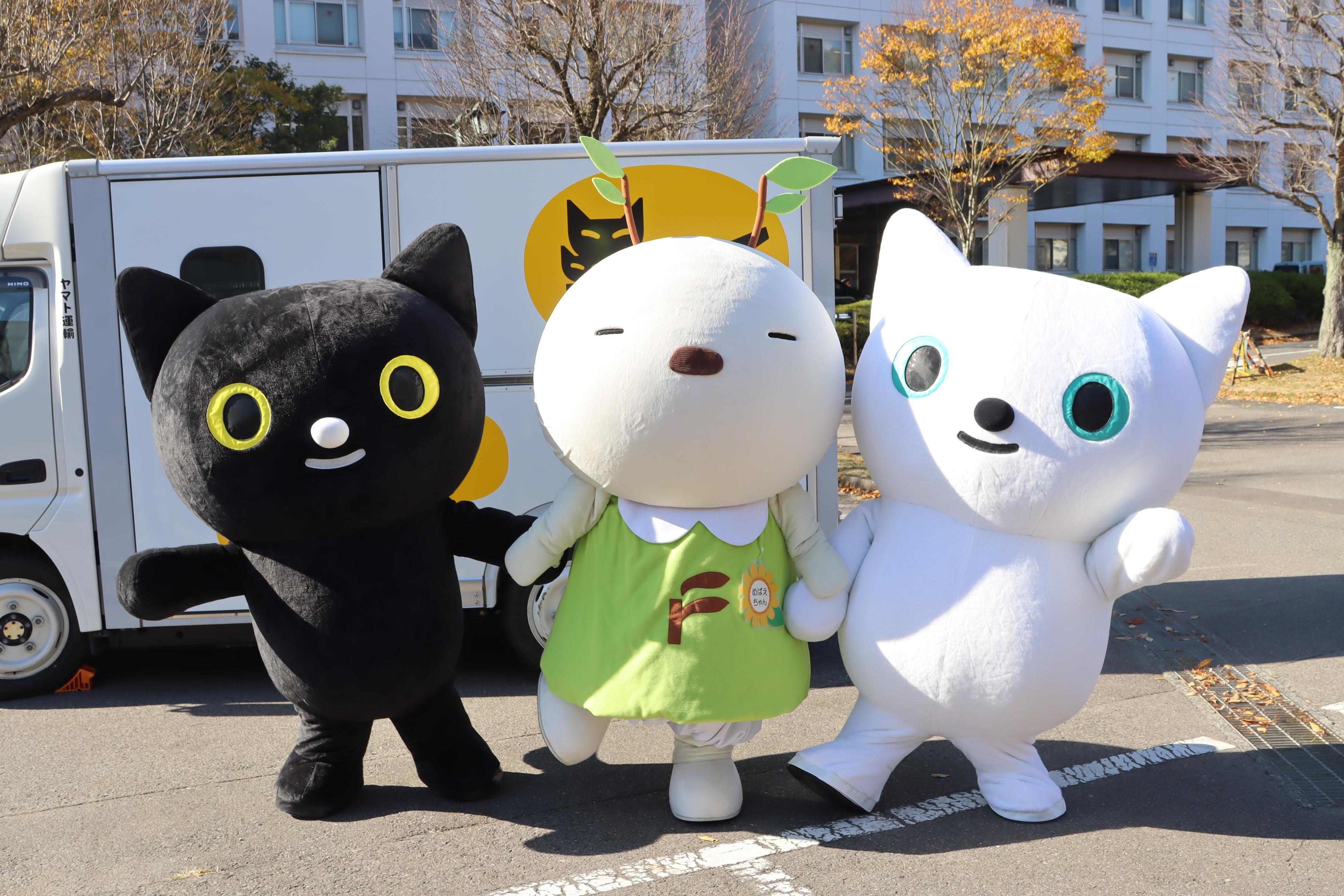 福島大学公式マスコットキャラクターのめばえちゃん(中央)、ヤマトグループ公式キャラクターのクロネコ・シロネコ(左右)